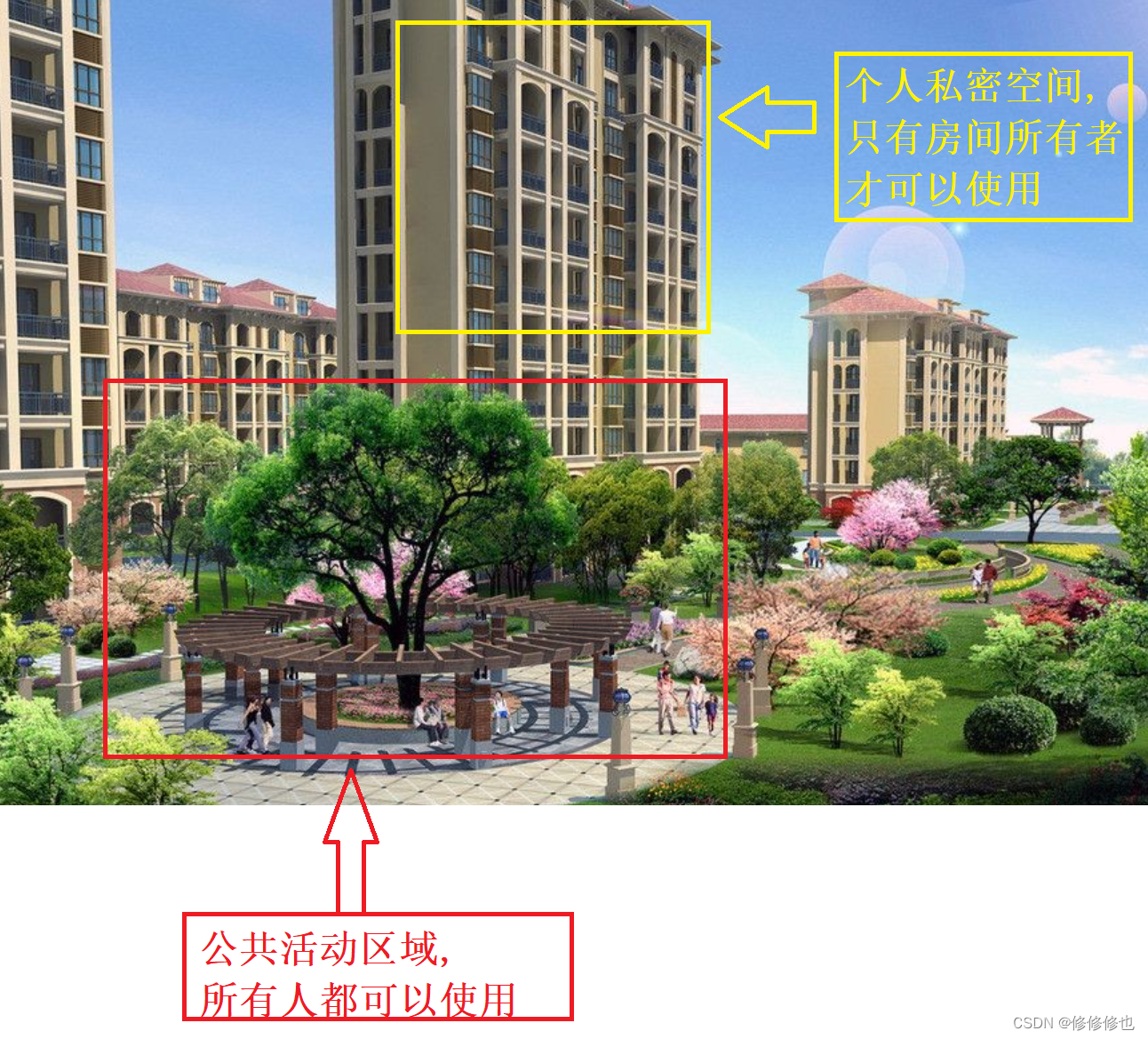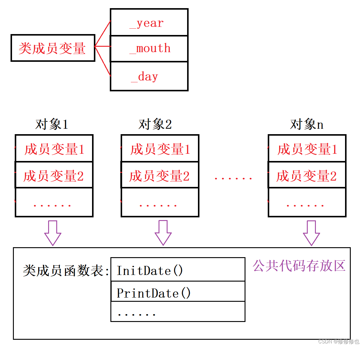 这样的存储策略其实并不难理解,打个比方说,如果我们将类比作一个小区,那么类对象中的成员变量就类似于一间一间的居民楼,供用户存放个人的物品使用,而类中的成员函数则类似于小区中的凉亭或健身器材区域,它是可以提供给所有小区中的人使用的,并且所有人使用它都是一样的,因此完全不需要给每家都修一个,而是可以整个小区只修建一个,大家一起使用就可以了。