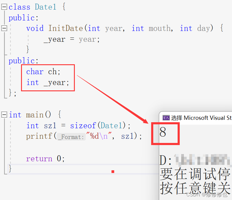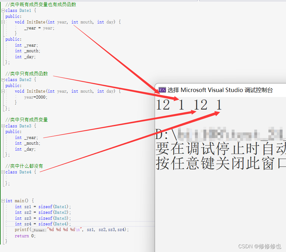 运行查看结果,可以看到,类的大小和类对象的大小是一致的,这和结构体与结构体变量的大小计算结果一致: