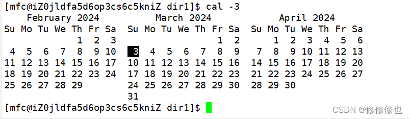 使用cal -3显示附近3个月日历: