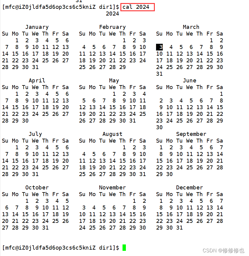 使用cal 2024显示2024年日历: