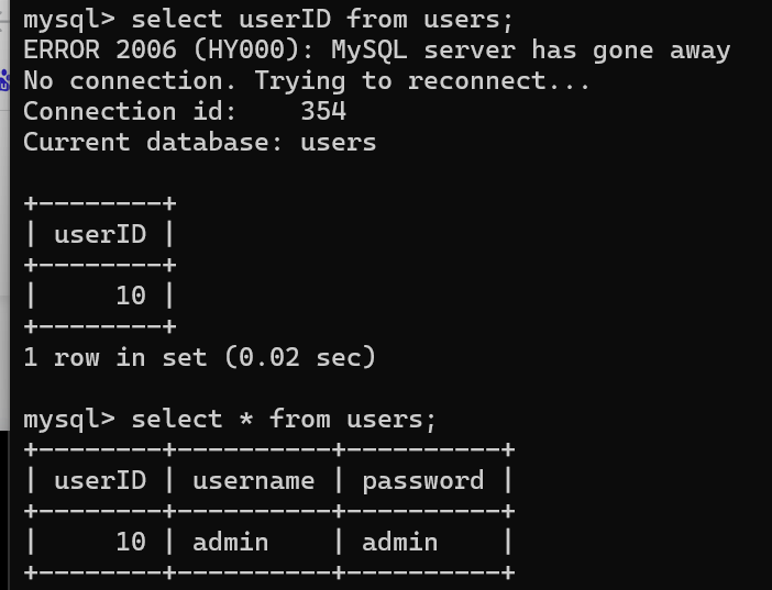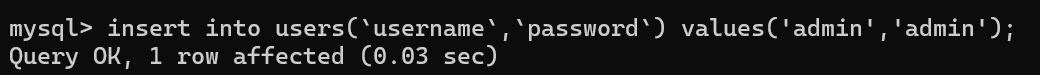insert into users(`username`,`password`) values('admin','admin'),('user1','user1');
