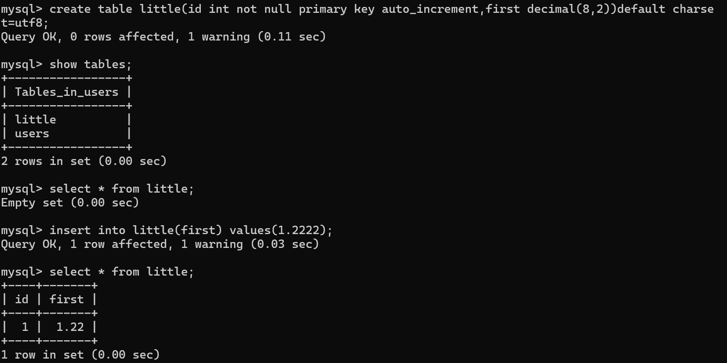 insert into little(first) values(1.2222);