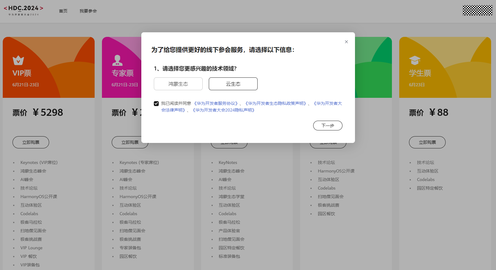 登录华为账号之后,打开华为开发者大会官网(https://developer.huawei.cn/home/hdc/hdc2024.html),点击【参会购票】或者直接下拉到票种展示区,进行选择。