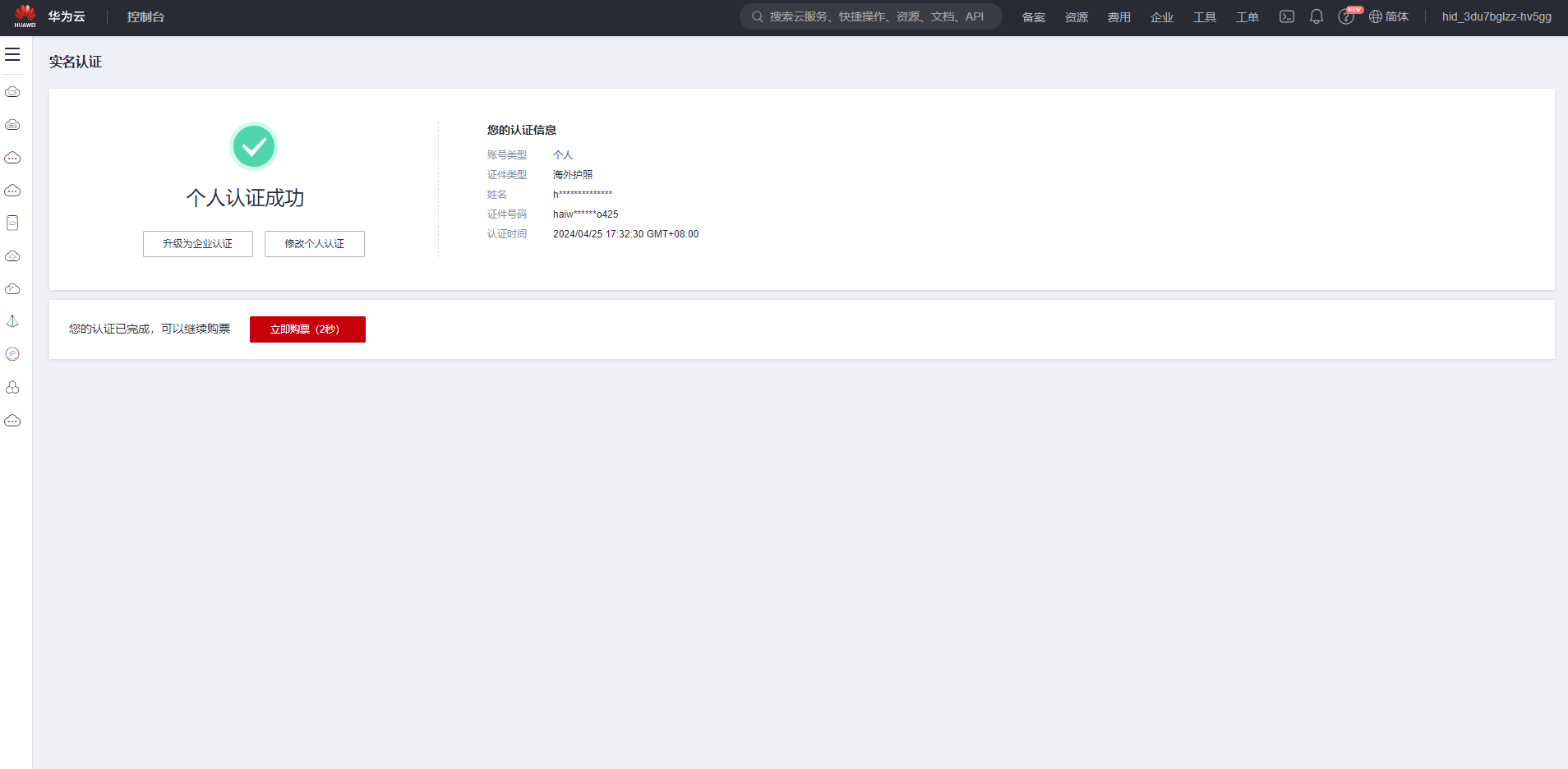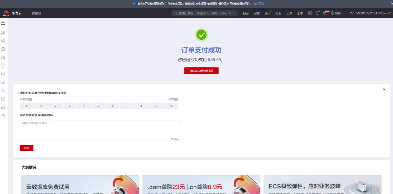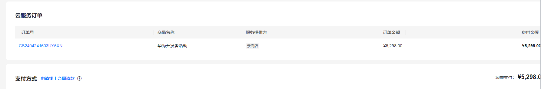 进行订单支付,支付方式支持华为云账户余额以及其他主流支付方式。