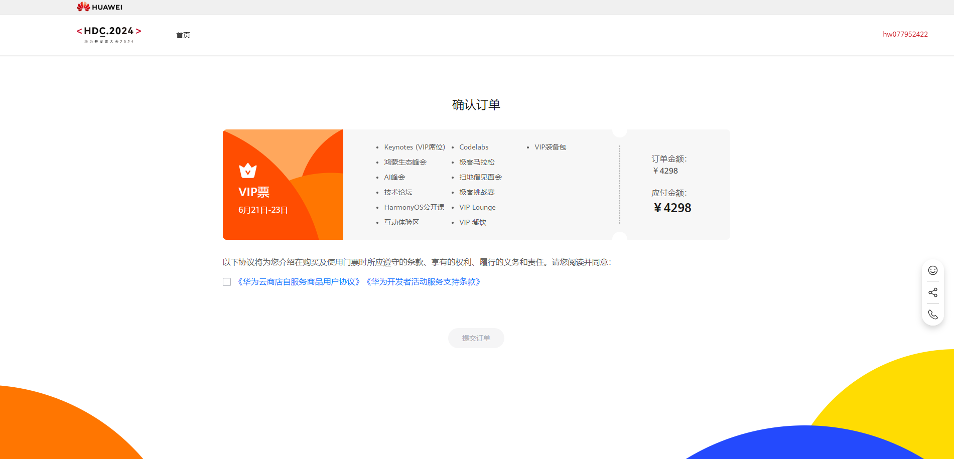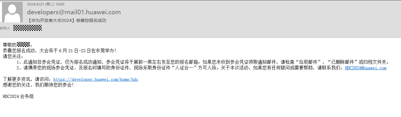 本次大会售票power by 华为云开发者联盟&华为云应用商店。如果大家在购票报名的过程中遇到任何问题,都可以通过大会官方邮箱HDC2024@huawei.com 获取客服支持。