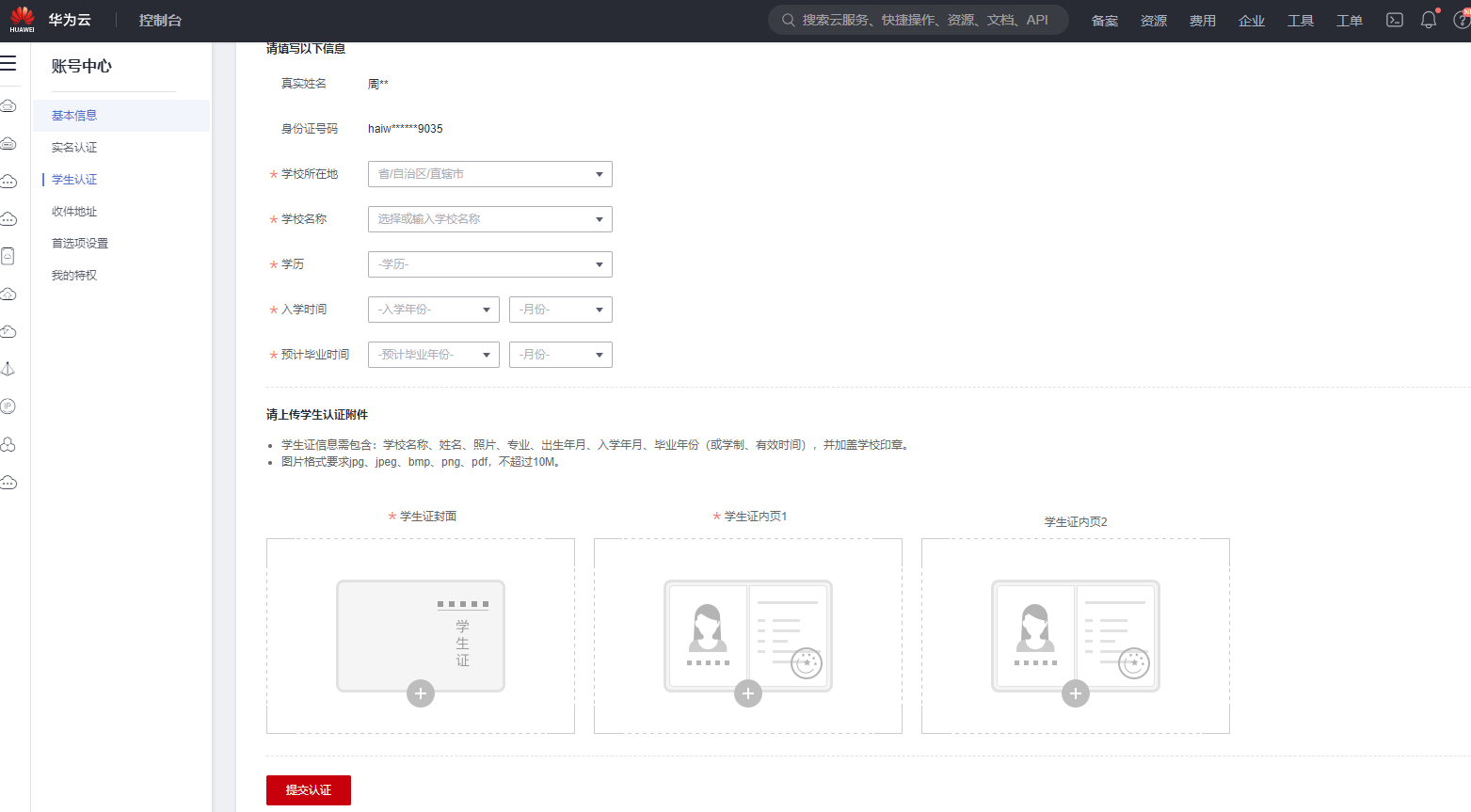 登录华为账号,进入账号中心,选择学生认证,填写相关信息,等待审核。(请先进行个人账号实名认证,再进行学生认证)实名认证信息预计1-3个工作日内审核完成。