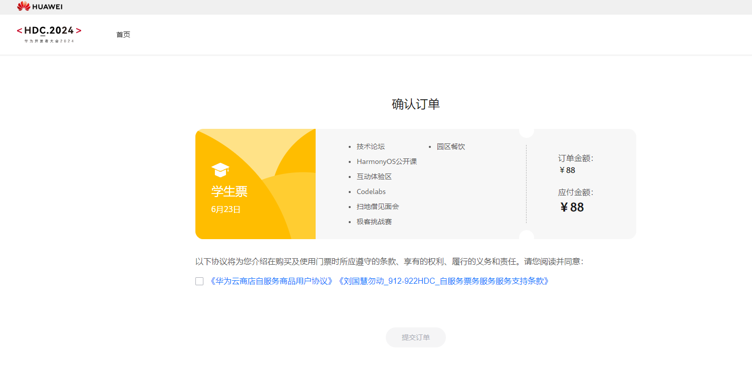 在选取【学生票】之后,首先同意并确认“华为开发者服务协议和隐私声明”。