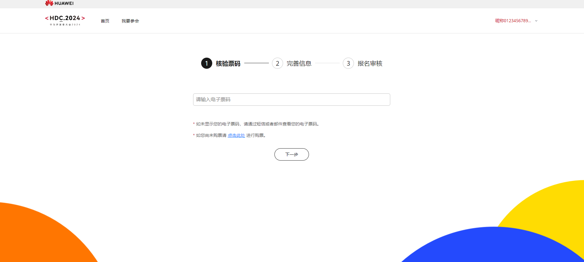 进入【报名页】,填写完整的【电子票码】。【电子票码】是在购票审核成功之后,系统以邮件和短信的方式,发送到购票者华为帐号注册时填写的手机/邮箱。
