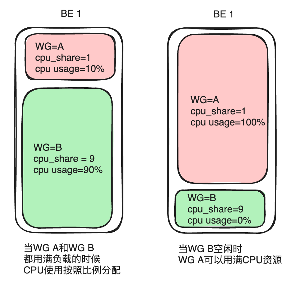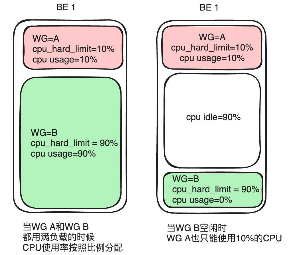 以 Group A 和 Group B 为例,若配置 Group A 的 cpu_hard_limit=10%,Group B 的cpu_hard_limit=90%。当两者单机 CPU 资源均达到饱和时, Group A 的 CPU 利用率为 10%, Group B 的 CPU 利用率为 90%,这与 CPU 软限是一样的。但是当 Group B 的负载降低或没有负载时,即便 Group A 增加查询负载,其最大 CPU 利用率仍被严格限制在 10%,无法获得更多的资源。虽然这种方式牺牲了资源分配的弹性,但也确保了查询性能的稳定性。