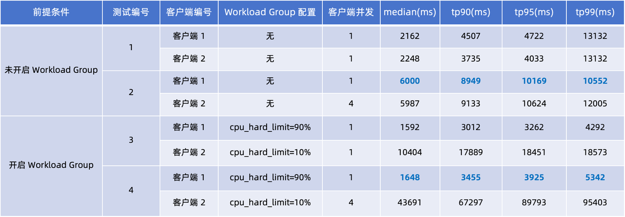 - 使用 Workload Group(测试 3、4): 这两次测试中应用了 CPU 硬限制:设置客户端 1
