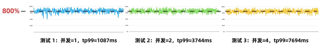 从上方测试结果可知,随着查询并发数的增加,CPU 的利用率的始终稳定在 800% 上下(在一个 16 核的机器上,800% 的意味着使用 8 个核,实际的 CPU 利用率 为 50%)。由于 CPU 资源被硬限,因此在并发增加时,tp99 延时增加是符合预期的。