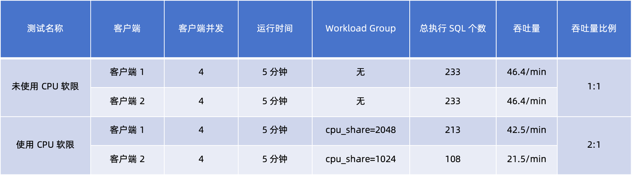 - 未使用 Workload Group 的情况下,两个客户端的吞吐量比例为 1:1,表明它们在相同运行时间内获得的 CPU 资源是相同的。