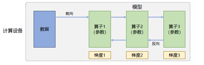 计算图的执行过程可以分为前向计算和反向计算两个阶段。前向计算的过程是将数据读入第一个算子,计算出相应的输出结构,然后依此重复这个前向计算过程,直到最后一个算子结束。反向计算过程,是根据优化函数和损失,每个算子依次计算出梯度,并利用梯度更新本地的参数。在反向计算结束后,该数据小批次的计算完成,系统就会读取下一个数据小批次,继续下一轮的模型参数更新。