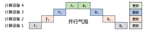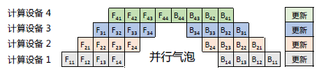 这种情况导致了设备的平均使用率大幅降低,形成了模型并行气泡(Model Parallelism Bubble),也称为流水线气泡(Pipeline Bubble)。