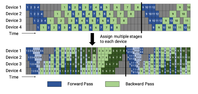1F1B 交错式调度模式要求micro-batch 的数量是流水线阶段的整数倍。每个设备不再仅负责连续多个层的计算,而是可以处理多个层的子集,这些子集被称为模型块。具体而言,在之前的模式中,设备1 可能负责层1-4,设备2 负责层5-8,以此类推。然而,在新的模式下,设备1 可以处理层1、2、9、10,设备2 处理层3、4、11、12,以此类推。这种模式下,每个设备在流水线中被分配到多个阶段。例如,设备1 可能参与热身阶段、前向计算阶段和后向计算阶段的某些子集任务。每个设备可以并行执行不同阶段的计算任务,从而更好地利用流水线并行的优势。这种模式不仅在内存消耗方面表现出色,还能够提高计算效率,使得大型模型的并行系统能够更高效地