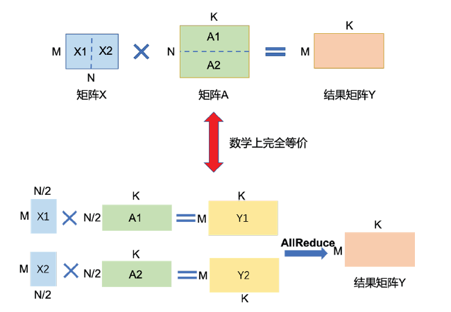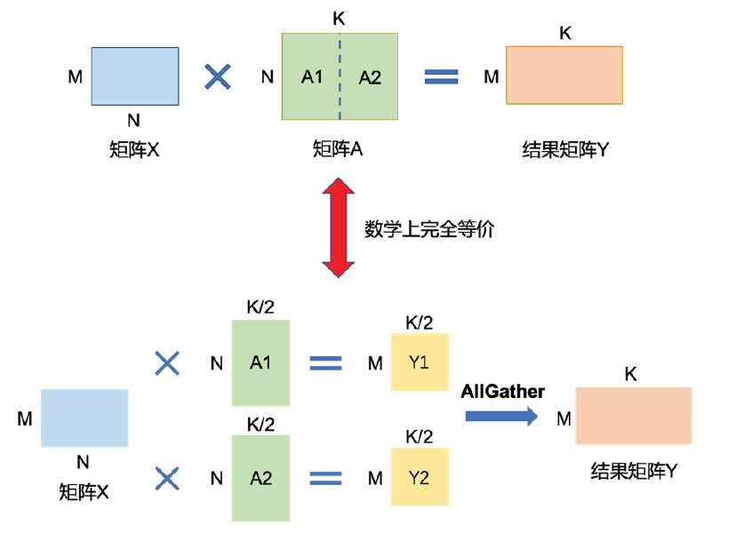 矩阵乘(MatMul)的张量并行要充分利用矩阵了分块乘法原理。举例来说,要实现如下矩阵乘法Y = X ×A,其中X 是维度为M × N 的输入矩阵,A 是维度为N ×K 的参数矩阵,Y 是结果矩阵,维度为M ×K。如果参数矩阵A 非常大,甚至超出单张卡的显存容量,那么可以把参数矩阵A 切分到多张卡上,并通过集合通信汇集结果,保证最终结果在数学计算上等价于单计算设备计算结果。参数矩阵A 存在两种切分方式: