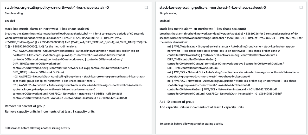 AutoMQ 基于简单策略实现了自定义的目标跟踪策略。该策略当前默认使用的是基于网络流量来触发弹性的执行的,在通用场景下可以满足绝大部分要求。相比云默认提供的目标跟踪策略具备更好的灵活性,可以做快扩慢缩,在实际生产应用中具有更加稳健的弹性效果。自定义目标跟踪策略主要由一个负责扩的简单弹性策略和一个负责缩的简单弹性策略构成。自定目标跟踪策略中,针对扩、缩的步长我们采用了按比例的调整,这样可以保证在不同集群规模下都有相同的扩缩容效率。在 AWS 上 ASG 上展现的弹性策略内容如下。