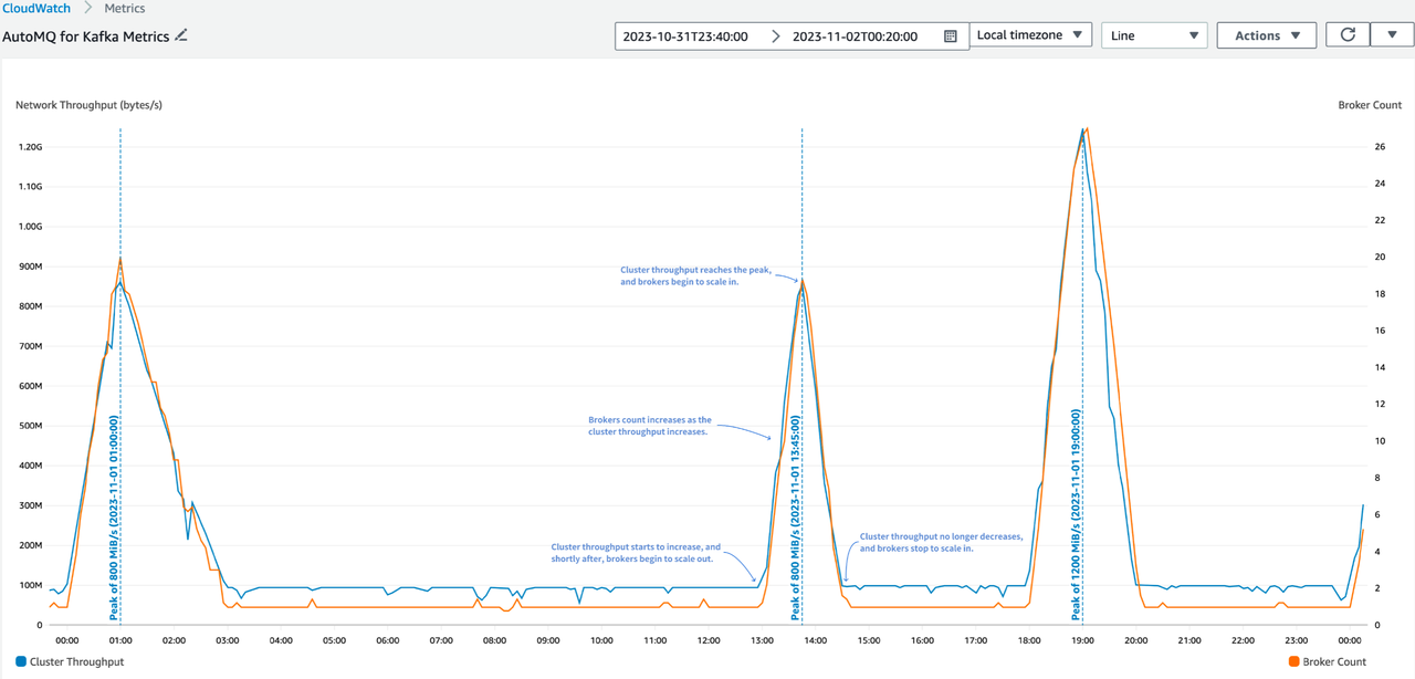 下图展示了 AutoMQ 在一个流量有变化的负载下,集群规模和集群网络流量的变化关系,可以看到 Broker 数量很好的拟合了流量曲线的变化,达到了自动弹性的效果。对于经常有变化的负载,开启自动弹性可以大大节约成本,达到 pay-as-you-go 的效果。关于具体的实验测试,可以参考我们的成本报告[4]。