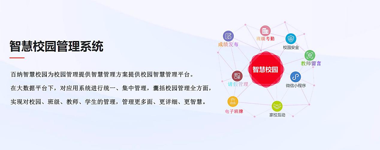 百纳依托云计算、大数据、物联网、人工智能等互联网技术,充分释放先进技术优势和人的智慧,构建智能感知环境和新型教育情景,为教育管理者、老师、学生减负增效。全方位、全流程、全生命周期的智慧教育整体解决方案,可以实现家校互动,资源共享,创新教育服务业态,推进教育治理方式变革,真正实现智慧校园和智慧化教学体系。