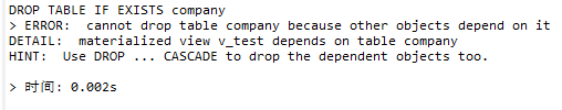 1)当删除物化视图中的源表时会报错,报错信息如下截图,可参考。
