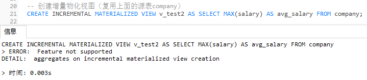 2)增量物化视图目前不支持聚合函数,报错信息如下图,可参考。