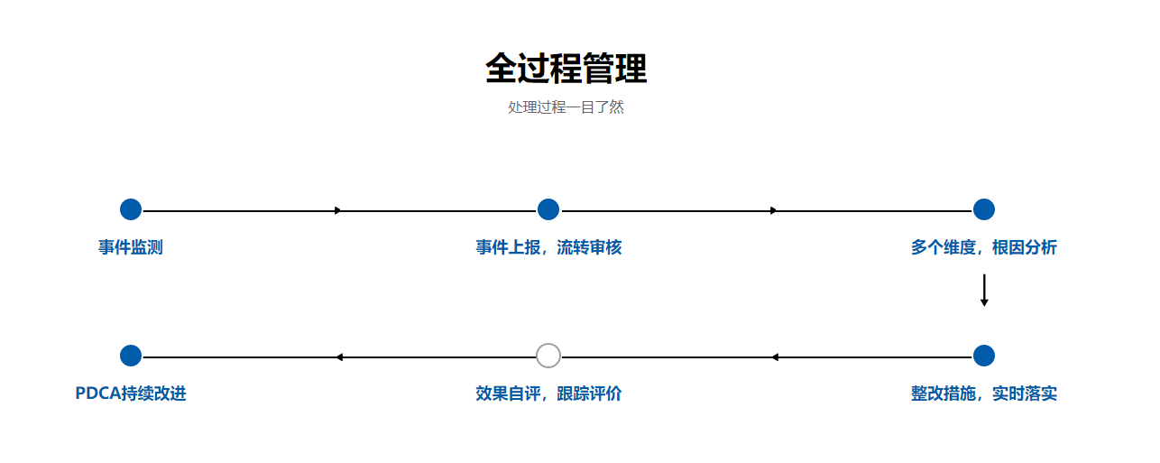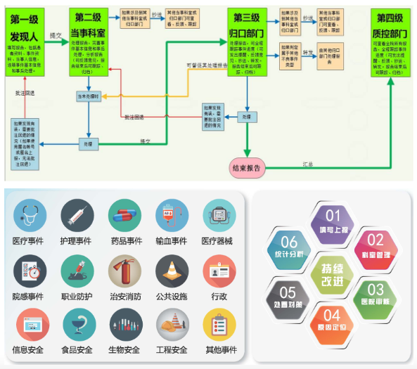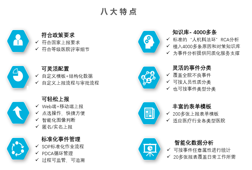 医院不良事件上报与管理系统结合现代医院管理思路,遵照PDCA全面质量循环管理方法而设计,并在多家大型三甲医院成熟运用。系统从事件上报、基于人、机、料、法 、环的RCA分析、事件整改、效果评估实现了结构化、标准化、智能化的管理和分析,满足医院可追溯化、全流程闭环管理要求,满足等级医院评审细则要求,大力提高医院不良事件上报的效率,保障事件分析的准确性,促进医疗安全的提高,避免同类事件再次发生,改善整个医院医疗安全,从而实现医院安全医疗的目标。