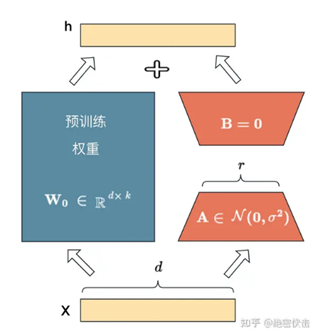 - LoRA:基于大模型的内在低秩特性,增加旁路矩阵来模拟全参数微调。冻结预训练模型参数,旁路增加可训练的降维矩阵A和升维矩阵B。 BA与预训练模型同维度。