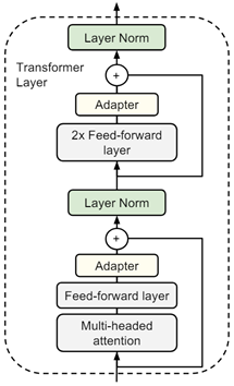- Adapter-Tuning:即在预训练模型的Transformer中加入Adapter层(如MLP)。微调阶段,仅训练Adapter层参数(约占总参数量5%),其他参数冻结。
