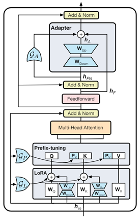 Adapter-Tuning、Prefix-Tuning、LoRA三种微调方法本质都是在冻结预训练模型基础上,新增部分参数可调的网络结构,以模拟全参数调整。UNIPELT将三种方式汇总在一起: