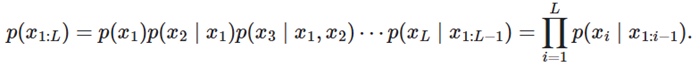 判别式AI学习样本数据的条件概率分布,即一个样本归属于特定类别的概率;而生成式AI则学习样本数据的联合概率分布,即样本中多个变量组成向量的概率分布。模型的推理过程则是自回归预测过程,即根据训练学习到的联合概率分布,逐步根据当前Token序列,计算出下一个Token的条件概率分布,并采样。例如序列x1:L的联合概率分布计算如下: