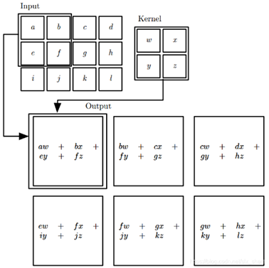 卷积操作本质是加权求和,卷积核就是共享的权重,如下所示: