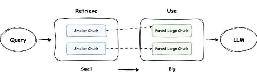 关键思想是将用于检索的chunk与用于合成的chunk分开。使用较小的chunk可以提高检索的准确性,而较大的chunk可以提供更多的上下文信息。具体来说,一种方法可以涉及检索较小的chunk,然后引用父ID以返回较大的chunk。或者,可以检索单个句子,并返回该句子周围的文本窗口。