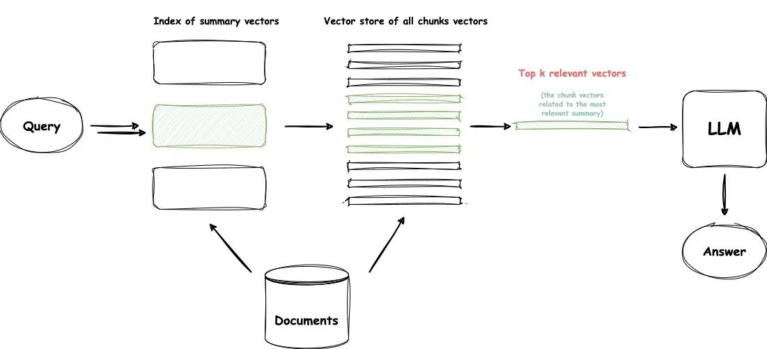 如果需要从许多文档中检索信息,我们需要能够高效地在其中搜索,找到相关信息并将其合成一个带有来源引用的单一答案。对于大型数据库,一种有效的方法是创建两个索引,一个由摘要组成,另一个由文档chunk组成,并进行两步搜索,首先通过摘要筛选出相关文档,然后仅在这个相关组内进行搜索。