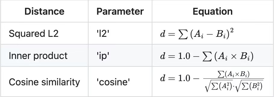 create_collection接受一个可选的metadata参数,该参数可以用来通过设置hnsw:space 的值来自定义嵌入空间的距离方法。