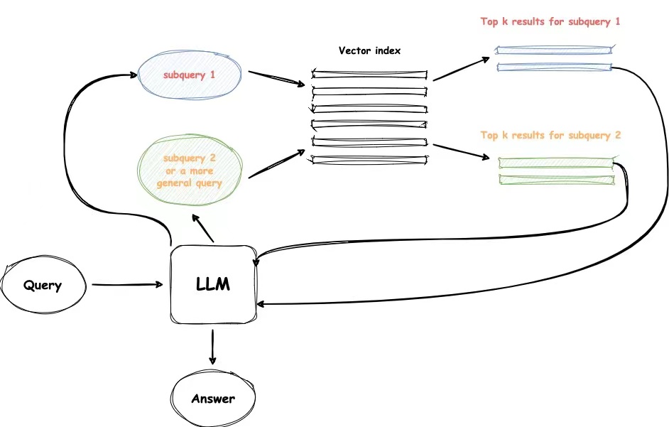 如果查询很复杂,LLM可以将其分解为几个子查询。例如,如果你问: