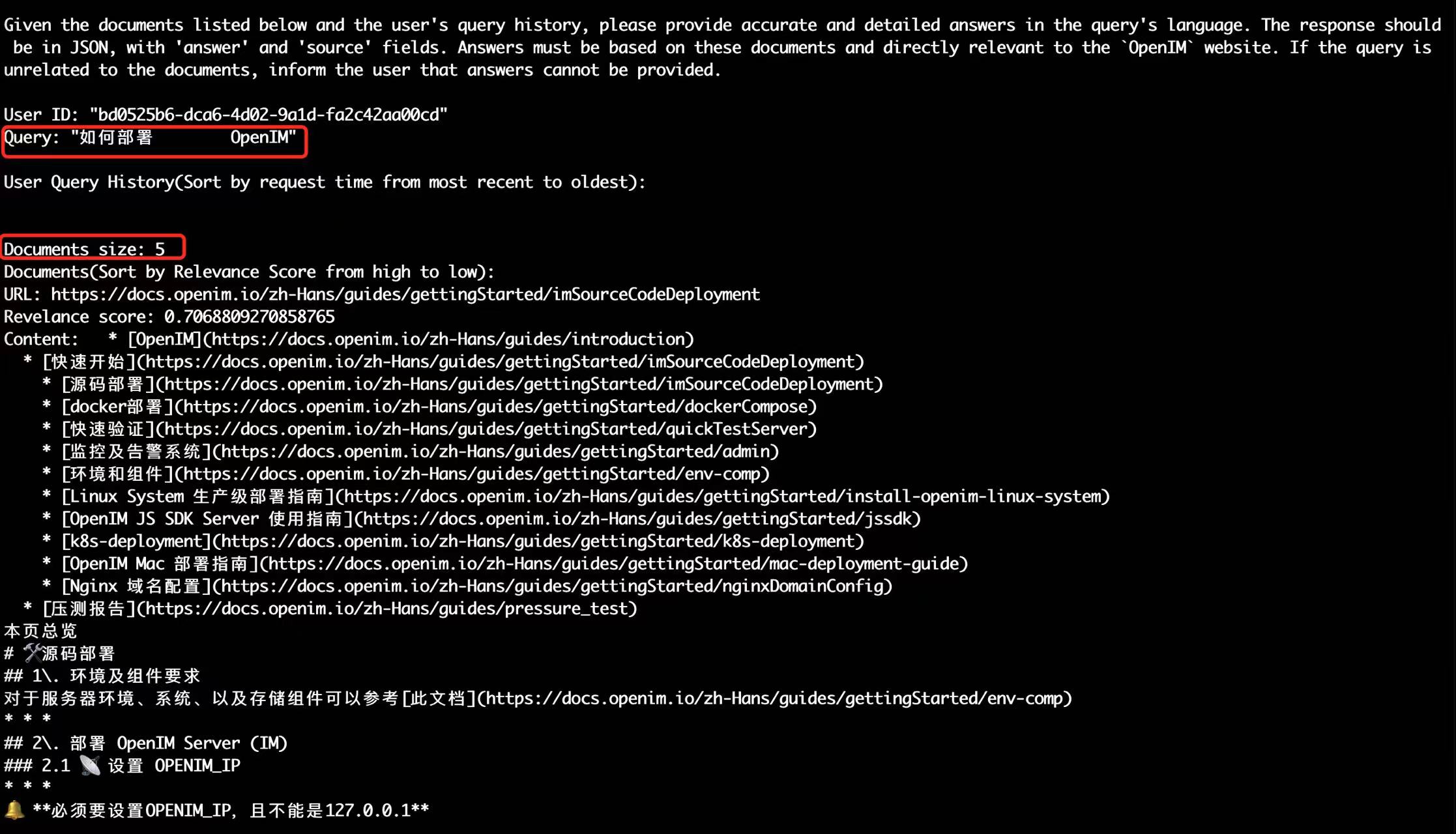 增加查询重写策略时,如果用户输入"如何部署",query会被改写为"如何部署\tOpenIM",此时召回的5篇文档的相关性分数都是大于0.5的,可以作为上下文传给GPT,最终GPT给出响应的答案。