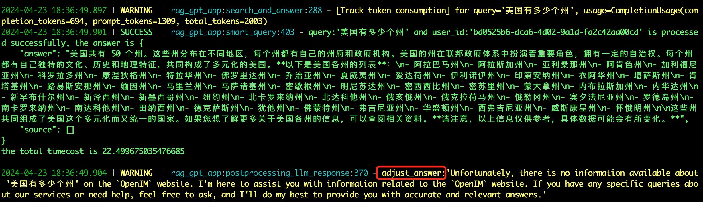 defpostprocess_llm_response(query, answer_json, site_title, recall_domain_set):ifanswer_json[‘source’]:answer_json[‘source’] = list(dict.fromkeys(answer_json[‘source’]))is_adjusted =False adjust_source = []forurlinanswer_json[‘source’]: domain = urlparse(url).netlocifdomaininrecall_domain_set: adjust_source.append(url)else:logger.warning(f"url:’{url}’ is not in{recall_domain_set}, it should not be returned!")ifnotis_adjusted:is_adjusted =Trueifis_adjusted:answer_json[‘source’] = adjust_sourcelogger.warning(f"adjust_source:{adjust_source}")ifnotadjust_source:ifsite_titlenotinanswer_json[‘answer’]:adjust_answer =f"Unfortunately, there is no information available about ‘{query}’ on the {site_title} website. I’m here to assist you with information related to the {site_title} website. If you have any specific queries about our services or need help, feel free to ask, and I’ll do my best to provide you with accurate and relevant answers.“logger.warning(f"adjust_answer:’{adjust_answer}’”)ifnotis_adjusted:is_adjusted =Trueanswer_json[‘answer’] = adjust_answerreturnis_adjusted
