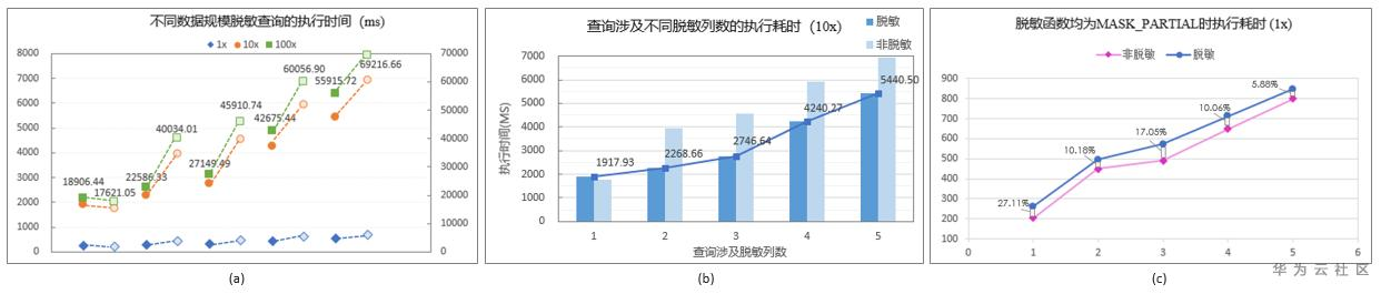 带有数据脱敏的语句执行,相较于原始语句,增加了数据脱敏的逻辑处理,势必会给查询带来额外的开销。这部分开销,主要受表的数据规模、查询目标列涉及的脱敏列数、脱敏列采用的脱敏函数三方面因素影响。