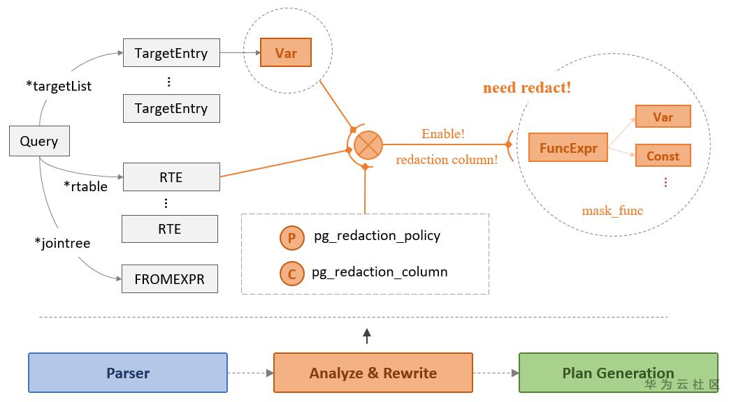 GaussDB (DWS)数据脱敏功能,基于SQL引擎既有的实现框架,在受限用户执行查询语句过程中,实现外部不感知的实时脱敏处理。关于其内部实现,如上图所示。我们将脱敏策略(Redaction Policy)视为表对象上绑定的规则,在优化器查询重写阶段,遍历Query Tree中TargetList的每个TargetEntry,如若涉及基表的某个脱敏列,且当前脱敏规则生效(即满足脱敏策略的生效条件且enable开启状态),则断定此TargetEntry中涉及要脱敏的Var对象,此时,遍历脱敏列系统表pg_redaction_column,查找到对应脱敏列绑定的脱敏函数,将其替换成对应的FuncExpr即可。经过上述对Query Tree的重写处理,优化器会自动生成新的执行计划,执行器遵照新的计划执行,查询结果将对敏感数据做脱敏处理。