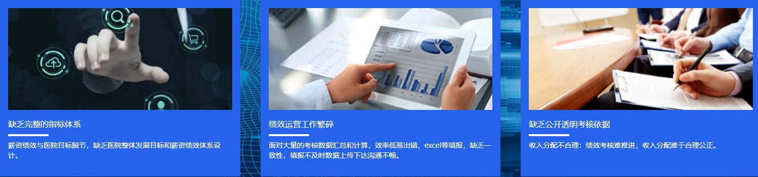 医院绩效解决方案包括医院绩效管理(BSC)、综合奖金核算(RBRVS),涵盖从绩效方案的咨询与定制、数据采集、绩效考核及反馈、绩效奖金核算到科到组、分配到员工个人全流程绩效管理;将医院、科室、医护人员利益绑定;全面激活人才活力;兼顾质量和效益、长期与短期利益;助力医院降本增效,持续改善、优化收入、成本结构。