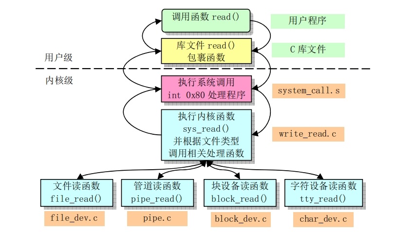 若返回的值小于 0,则表示此次读操作出错,于是将出错号取反后存入全局变量 errno 中,并向应用程序返回-1 值。从用户程序执行 read()函数到进入内核中进行实际操作的整个过程如下图 所示。