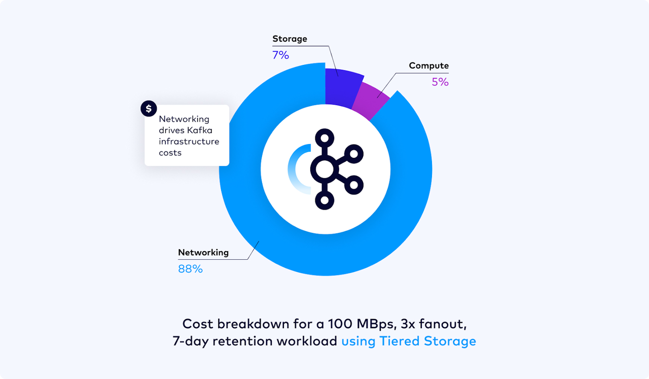 - 多AZ网络流量成本:云厂商对于用户在多个 AZ 之间进行网络传输会收取大量的费用,在 Confluent 的博客中对 Kafka 的成本进行分析发现网络成本的占比可达 80% 以上 [6]。如果部署一个支持多 AZ 容灾、三副本的 Kafka 集群,基于本地磁盘的 Shared Nothing 架构在客户端对 Kafka 集群进行读写以及扩缩容时,由于分区数据的跨 AZ 数据复制,将产生大量的网络 I/O 及由此引发的成本支出,是一种非常不经济的做法。