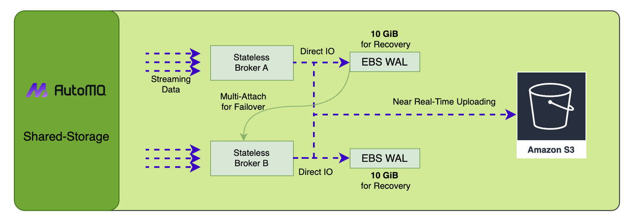 如果不仔细了解我们存储架构的优势,很容易将这种创新的共享存储架构与 Tiered Storage 弄混。分层存储中的 Broker 本质上仍然是一个有状态的 Broker,其强耦合本地磁盘。而我们的 Shared Storage 架构中 Broker 与 EBS 实际上是解耦的。当计算节点崩溃时,利用 EBS 多重挂载 [11] 和 NVME reservations[12] 能力,可以在毫秒级完成故障转移与恢复。AutoMQ 的 Shared Storage 存储架构将 EBS 视为共享存储来设计。EBS 卷可以在 EC2 故障时,通过多重挂载技术快速挂载至其他节点,以业务无感的方式继续提供读写服务。从这个角度来看,EBS 跟 S3 一样都是共享存储,而非有状态的本地磁盘。对于 EBS 来说,其与 Broker 完全解耦,因此在 AutoMQ 中,Broker 是无状态的。EBS 与 S3 本质都是云提供的存储服务,通过充分利用云存储的特性,我们可以在 Broker 之间无缝地共享 EBS 卷,形成我们创新的 Shared Storage 架构。