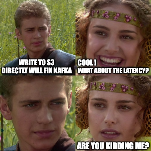 直接写对象存储虽然解决了 Kafka 有状态 Broker 引发的一系列诸如弹性、跨 AZ 网络费用等诸多问题,但这显然不是 Shared Storage 架构上最优的存储方案。一般而言,直接写 S3 将会导致 600ms 以上的 [9] 延迟,这在很多实时性场景都是不可接受的。在设计系统时,我们需要确保高频使用路径具有最低的延迟和最优的性能。在 Kafka 的使用场景中,读取热数据是一个高频路径,我们需要确保其拥有最低的延迟和最优的性能。当前,仍然有大量客户使用 Kafka 来替代传统的消息队列系统,如 RabbitMQ。这些应用场景对延迟都有极高的敏感度,百毫秒级的延迟可能会导致消息处理产生不可接受的延迟,从而影响业务流程和用户体验。虽然直接写入 S3 在某些场景下可能提供了一种成本效益高的存储解决方案,但它并没有解决 Kafka 在高频数据处理路径上的低延迟需求。为了保持 Kafka 作为流处理平台的竞争力,必须在设计中平衡成本和性能,特别是在高频数据路径上,以确保用户体验和系统性能不受影响。因此,寻找一种既能降低成本、提升 Kafka 弹性能力又能保持低延迟的存储方案成为了我们对 Kafka 创新的重要目标。