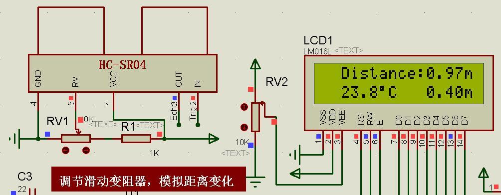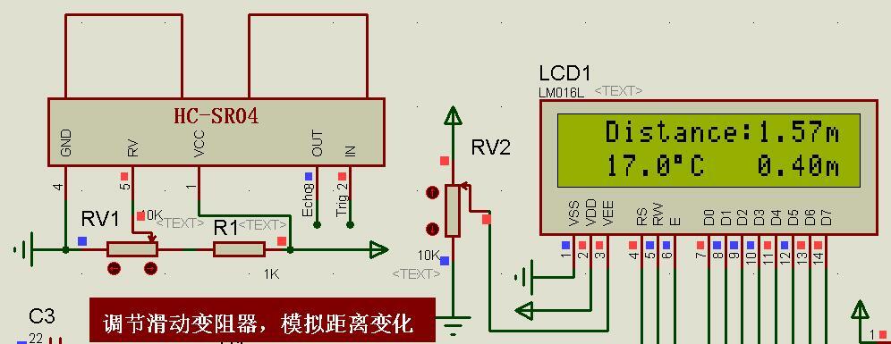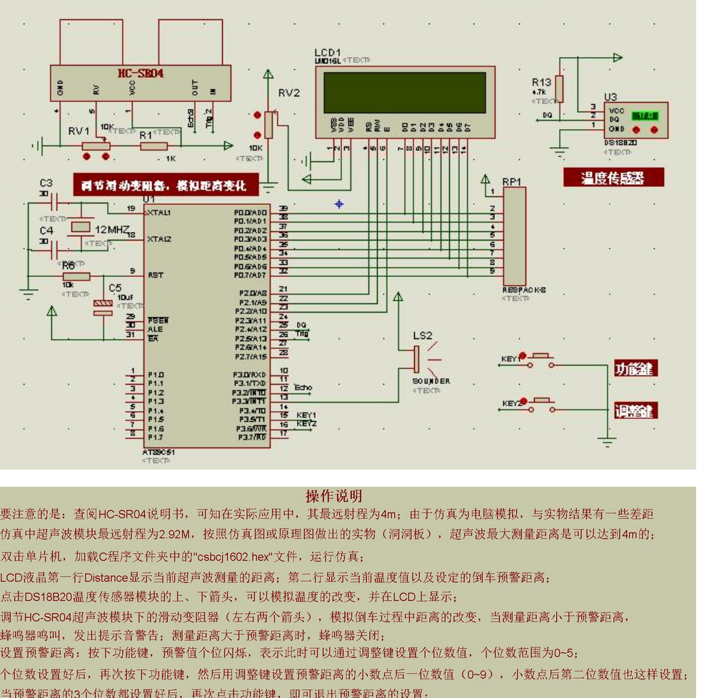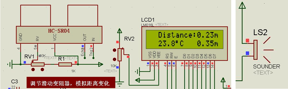 点击DS18B20温度传感器模块的上、下红色箭头,模拟温度值的变化;调节HC-SR04超声波模块下的滑动变阻器RV1(左右两个箭头),模拟倒车过程中距离的改变。设计咨询,作者QQ:2327603104.