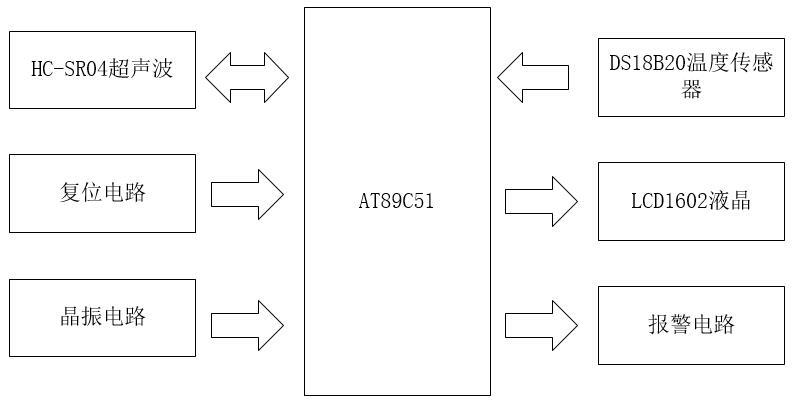 系统由AT89C51控制器、HC-SR04超声波模块、DS18B20温度测量模块、声音报警电路和LCD1602显示电路组成。