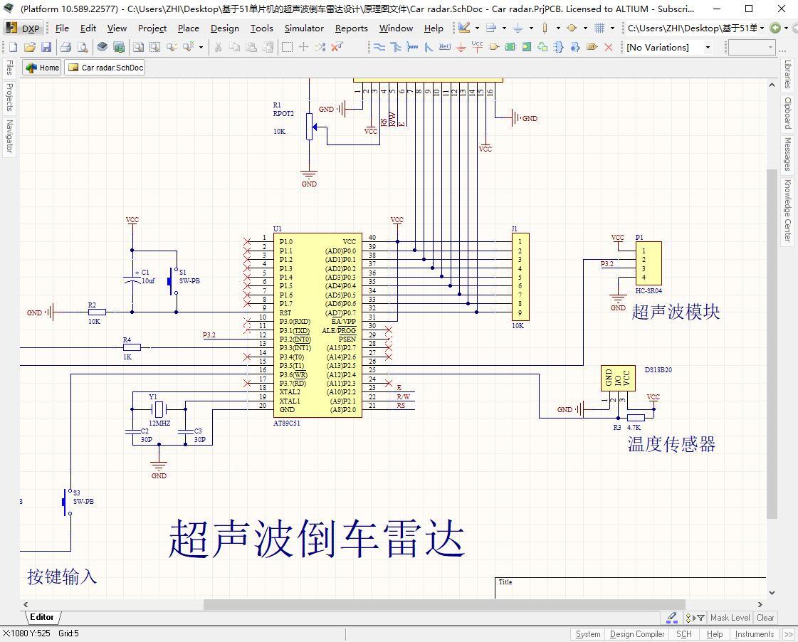 本课题以AT89C51单片机为核心设计一种超声波倒车雷达系统,同时兼顾车内温度测量。