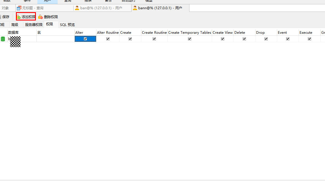选择执行的用户,如果没有用户也可以选择新建用户。 选择权限,添加权限