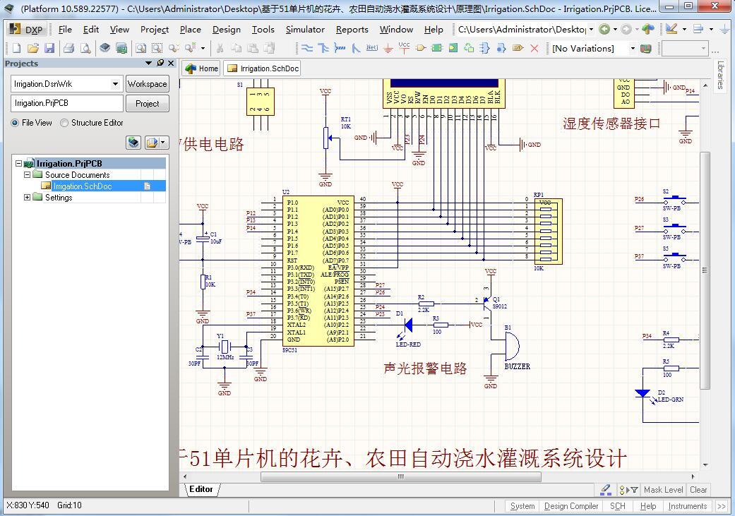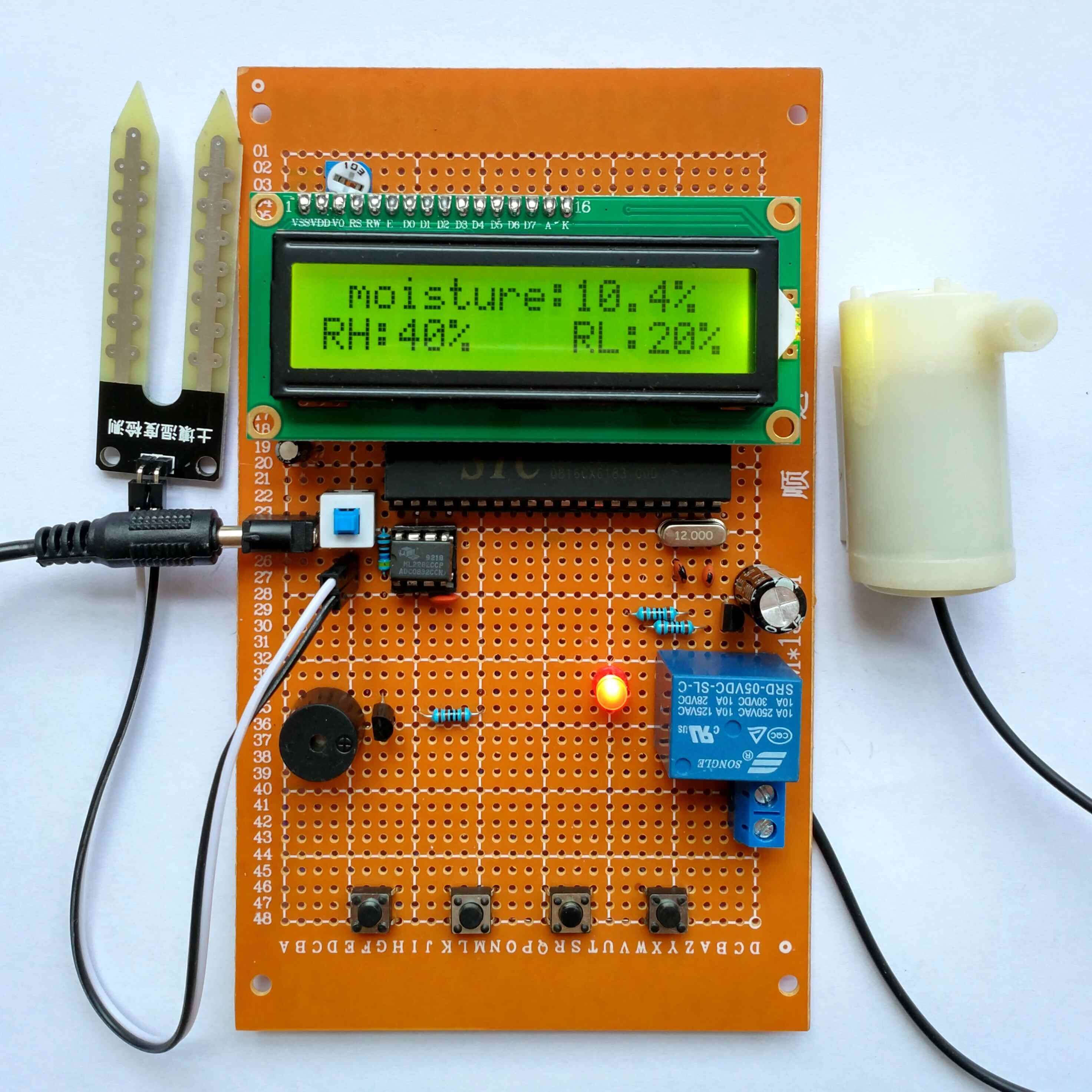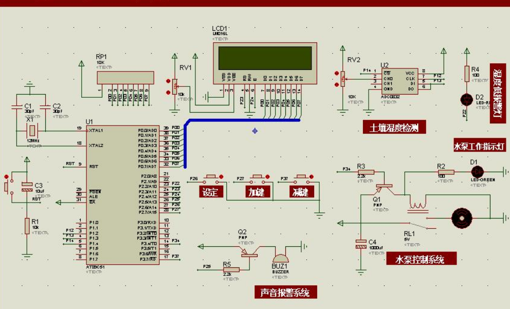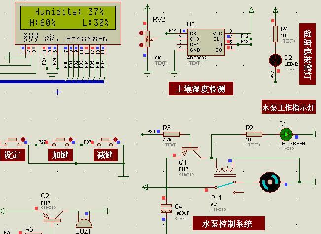 当土壤湿度低于下限时,驱动水泵工作进行灌溉浇水,并提供声光报警。设计获取,蒋宇智QQ(2327603104)。