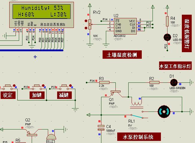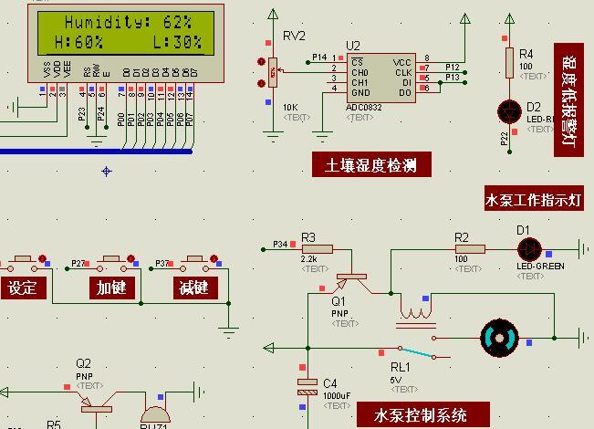 需要说明的是,水泵停止工作(即:土壤湿度超过上限)后,调节RV2模拟土壤湿度的下降,在下降到上下限范围内时,水泵不会启动,只有土壤湿度继续下降至低于下限时才会启动。